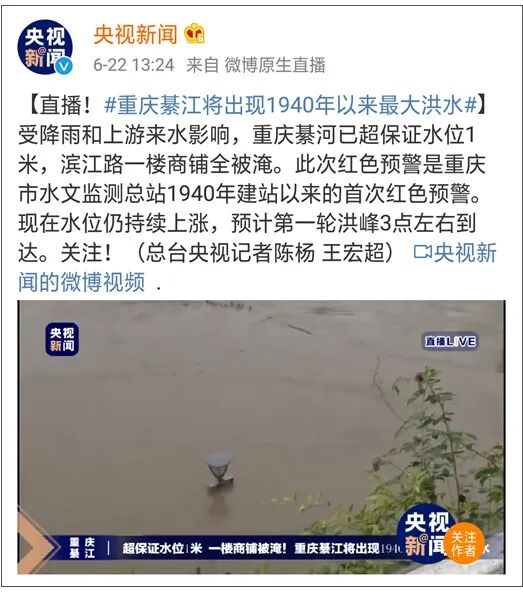 重庆水文监测总站发出1940年来首次红色预警,重庆綦江将出现1940年以来最大洪水。
