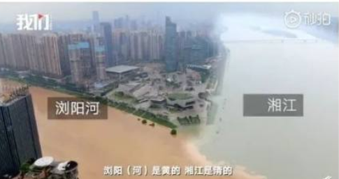 长沙,因为洪水导致浏阳河和湘江呈现出了泾渭分明的景象,网友却说:“看,好像鸳鸯锅!”