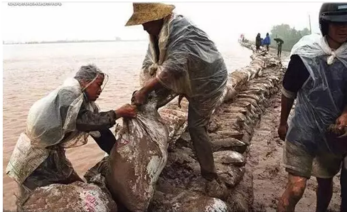 那个时候,到处是这样的沙袋一摞摞码放在河边抵抗洪水的侵袭: