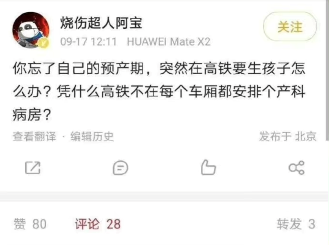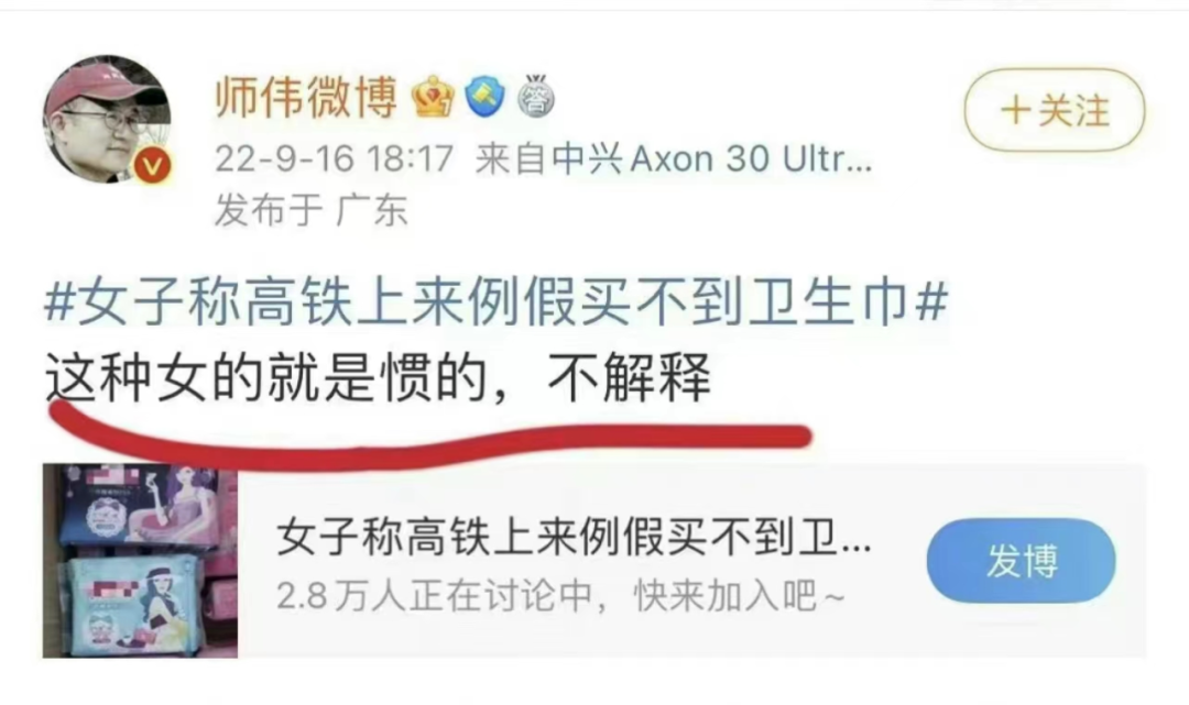 一个女生发现高铁上没有卖卫生巾的,想让高铁以后出售卫生巾,这也有人会嘲讽,确实出乎我的意料。