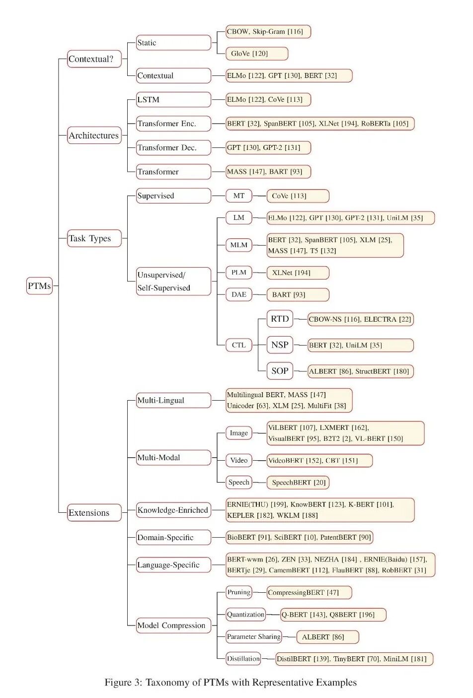 为了明确现有PTMs与NLP之间的关系,我们构建了PTMs的分类法,该分类法从不同的角度对现有PTMs进行了分类: (1) PTMs使用的单词表示类型,(2) PTMs使用的主干网络,(3) PTMs使用的预训练任务类型,(4) 为特定类型的场景或输入设计的PTMs。图6显示了分类以及一些相应的代表性PTMs。