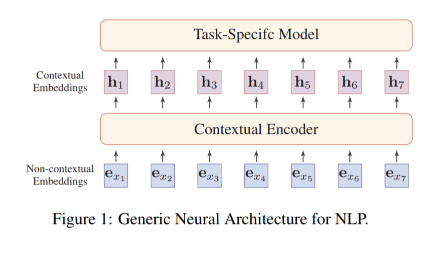 分布式表示的核心思想是用低维实值向量来描述文本的意义。而向量的每一个维度都没有对应的意义,而整体则代表一个具体的概念。图1说明了NLP的通用神经体系结构。词嵌入有两种:非上下文嵌入和上下文嵌入。它们之间的区别是,一个词的嵌入是否根据它出现的上下文动态变化。