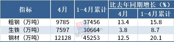 国家统计局数据显示,2021年4月份,我国粗钢日均产量326.2万吨,生铁日均产量253.2万吨,钢材日均产量404.3万吨。