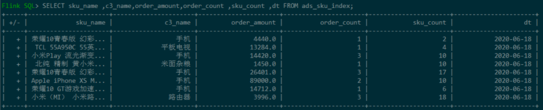 关于ODS层的数据同步参见我的另一篇文章基于Canal与Flink实现数据实时增量同步(一)。主要使用canal解析MySQL的binlog日志,然后将其写入到Kafka对应的topic中。由于篇幅限制,不会对具体的细节进行说明。同步之后的结果如下图所示: