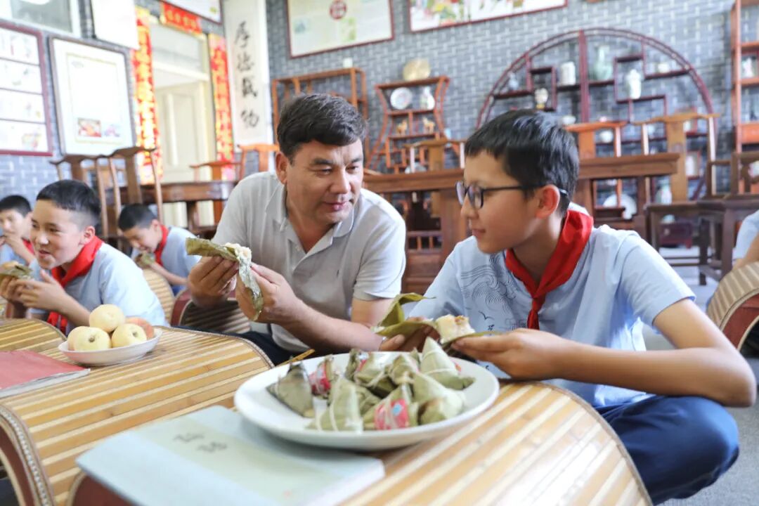 ▲库尔班与学生们一起吃粽子,粽子是新疆各族群众日常喜爱的美食。![]()