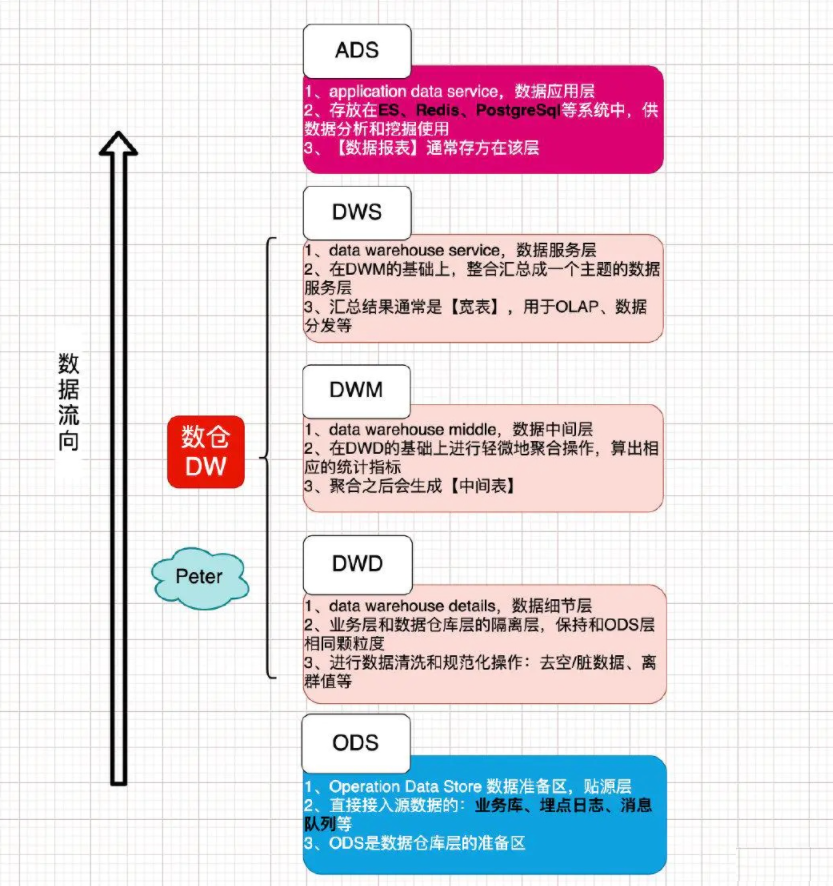 每个公司的业务都可以根据自己的业务需求分层不同的层次;目前比较成熟的数据分层:数据运营层ODS、数据仓库层DW、数据服务层ADS(APP)。