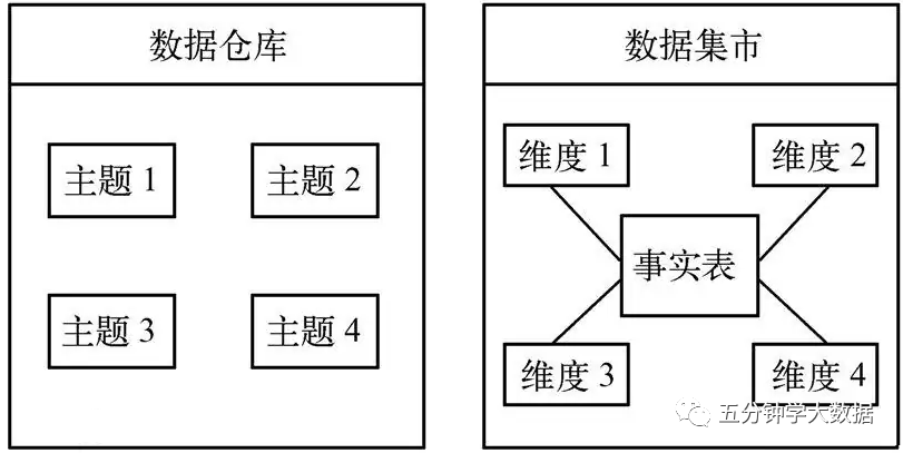 数据集市就是企业级数据仓库的一个子集,它主要面向部门级业务,并且只面向某个特定的主题。为了解决灵活性与性能之间的矛盾,数据集市就是数据仓库体系结构中增加的一种小型的部门或工作组级别的数据仓库。数据集市存储为特定用户预先计算好的数据,从而满足用户对性能的需求。数据集市可以在一定程度上缓解访问数据仓库的瓶颈。 理论上讲,应该有一个总的数据仓库的概念,然后才有数据集市。实际建设数据集市的时候,国内很少这么做。国内一般会先从数据集市入手,就某一个特定的主题(比如企业的客户信息)先做数据集市,再建设数据仓库。数据仓库和数据集市建立的先后次序之分,是和设计方法紧密相关的。而数据仓库作为工程学科,并没有对错之分。 在数据结构上,数据仓库是面向主题的、集成的数据的集合。而数据集市通常被定义为星型结构或者雪花型数据结构,数据集市一般是由一张事实表和几张维表组成的。