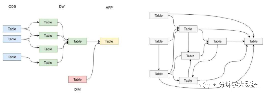 在实际的工作中,我们都希望自己的数据能够有顺序地流转,设计者和使用者能够清晰地知道数据的整个声明周期,比如下面左图。 但是,实际情况下,我们所面临的数据状况很有可能是复杂性高、且层级混乱的,我们可能会做出一套表依赖结构混乱,且出现循环依赖的数据体系,比如下面的右图。