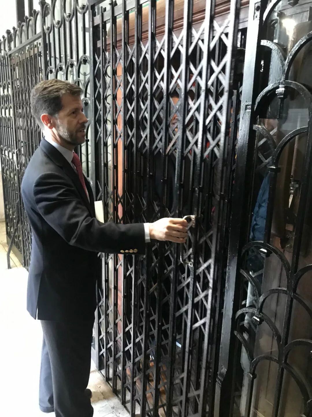 △当天在议会大厦拍摄的记者乘坐这部一百多岁的电梯到达二楼贵宾厅。这部古旧的电梯被特意保留在历史建筑里继续提供服务。(央视记者许永松拍摄)
