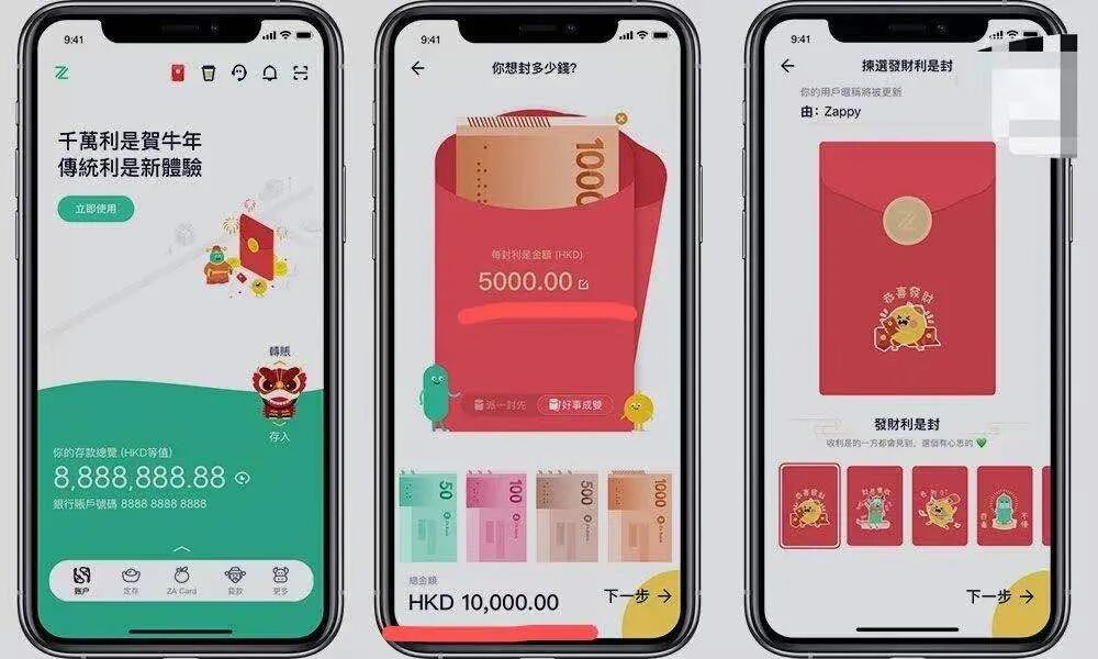 虚拟银行众安银行年三十大派1000元开工利是,众安国际香港办公室的员工可以在手机上拆电子利是拿“金牛”(港币1000元)。