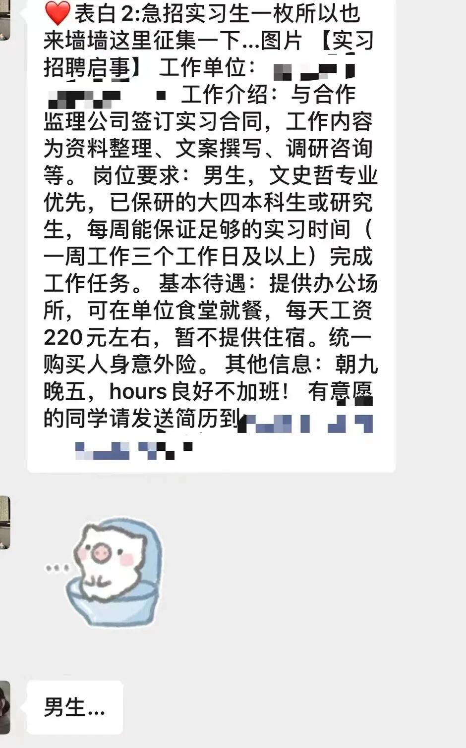 第一次看到这则招聘消息,是我的室友转发在宿舍群里,她在我们学校的一个表白墙上看到的。招聘消息里面明确写了,要求是男生。但是做的只是一个非常简单的、类似文秘一样的工作,根本没有什么性别的特殊性。我们几个人当时只是在群里吐槽,觉得很不满。