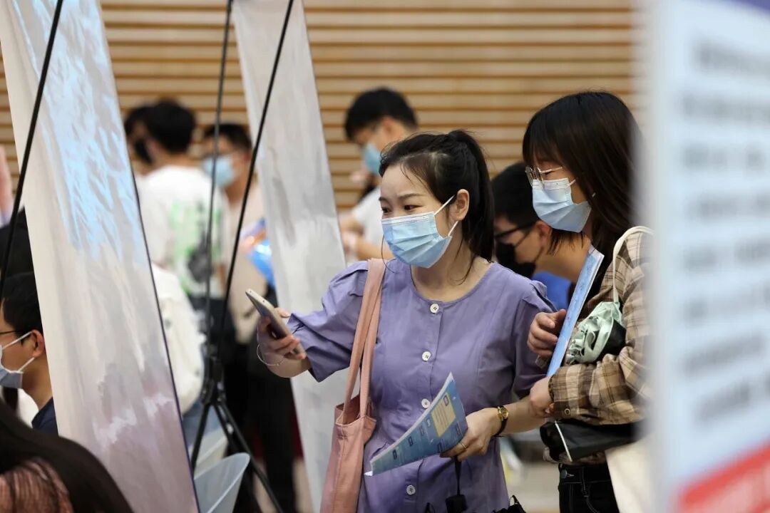 某高校专场招聘会现场,两名女生正在浏览招聘信息图源视觉中国