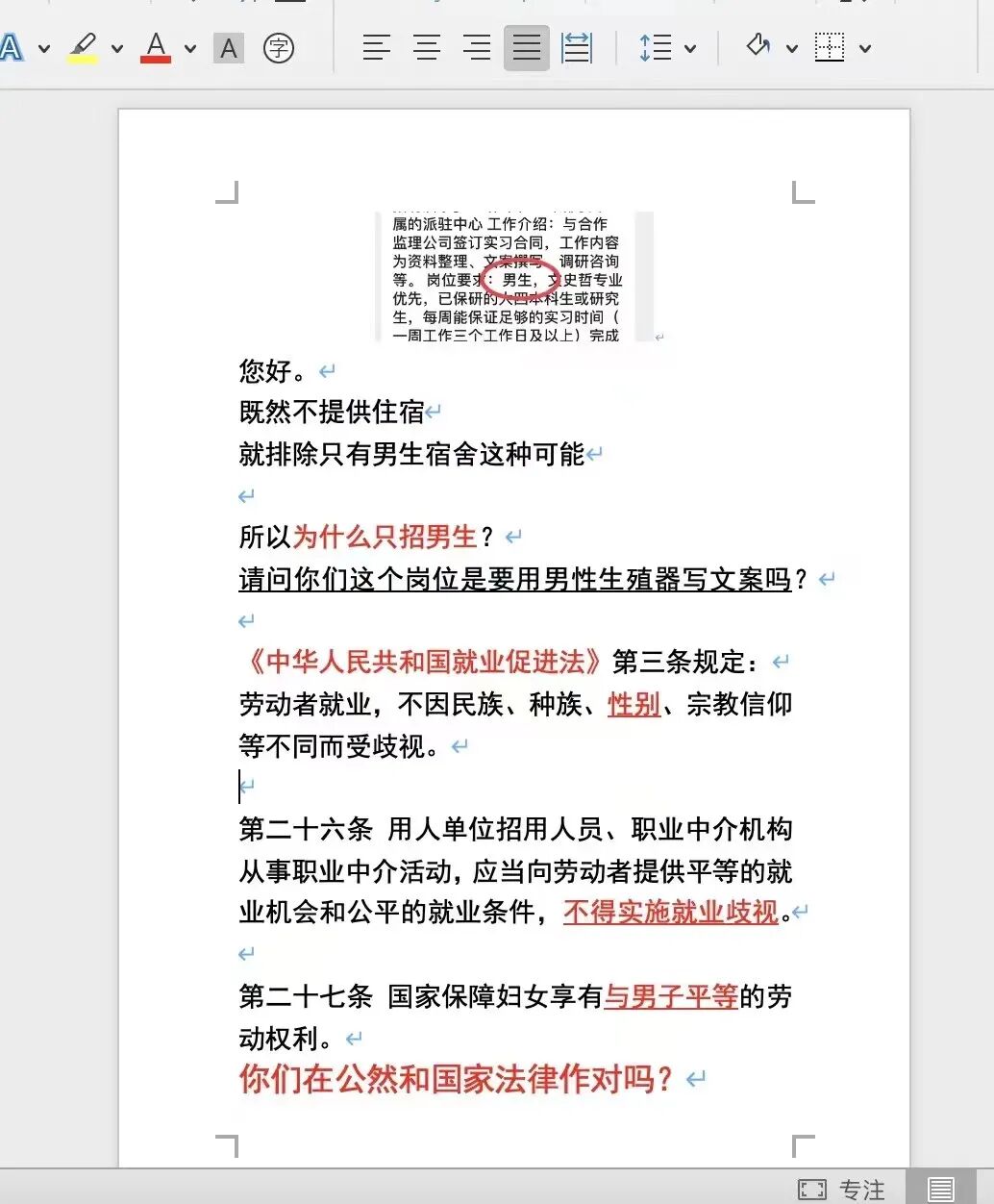 我在网上搜了法律条款,想让自己的质疑看起来更有底气一点。我就写道,《中华人民共和国就业促进法》,第三条规定:劳动者就业,不因民族、种族、性别、宗教信仰等不同而受歧视。我把「性别」两个字标红,加下划线。还有第二十六条,「不得实施就业歧视」;第二十七条,「国家保障妇女享有与男子平等的劳动权利」。在最后面放大加粗:你们在公然和国家法律做对吗?