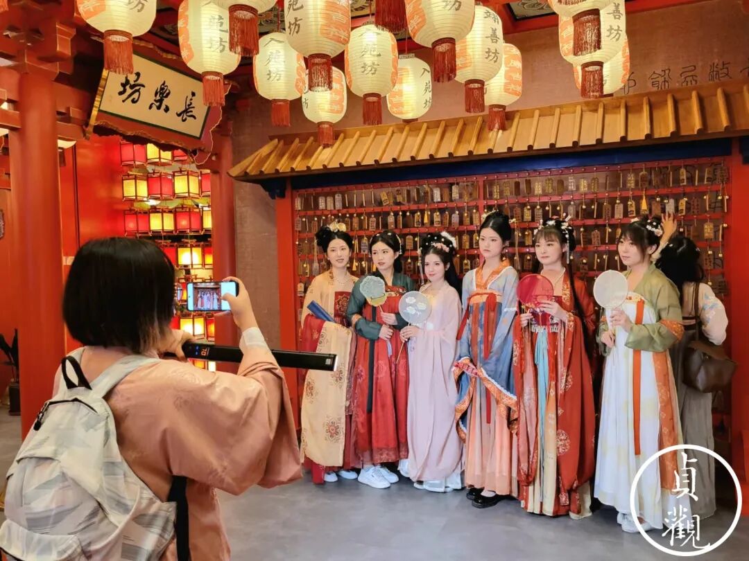 在这个沉浸式的汉服迪士尼中,你在随处都可以遇见拍照的游客。或者说,这地方本来就是为了拍照而建的。