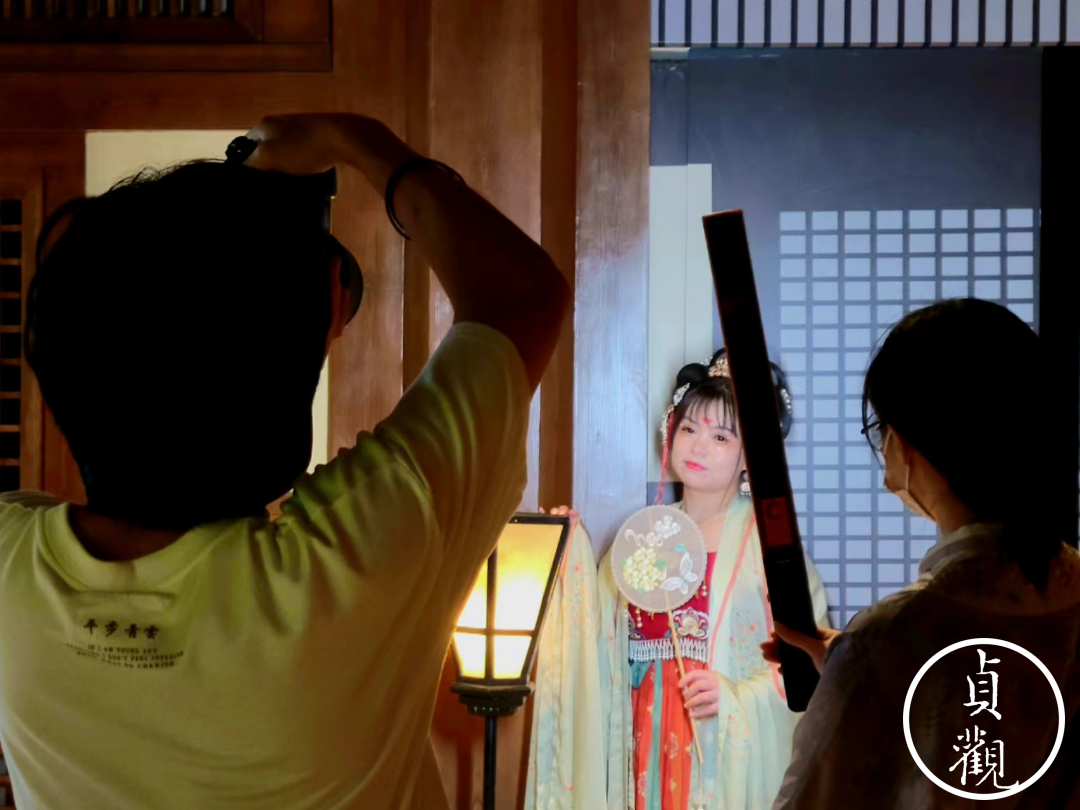 零碎的道具更是不用说。宫灯、鱼符、团扇,不管穿没穿汉服都能直出大片。简陋一些的,大多是自己找个角度自拍。专业的团队则配上了摄影师和补光师,化好全妆拍照的不在少数。