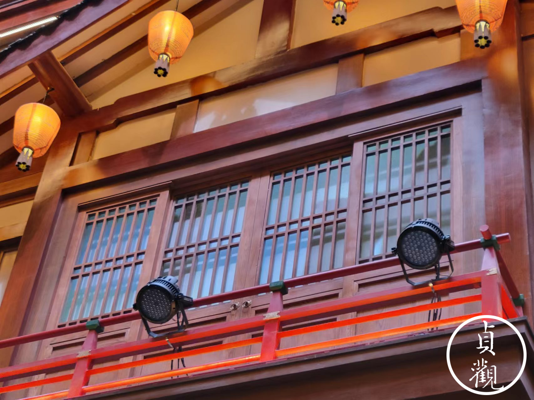 如今穿过门廊,一幢偌大的仿唐建筑就矗立眼前。华美夸张的木质屋檐,搭配着各式各样的彩灯,根本不会让人想起外边还是白天。