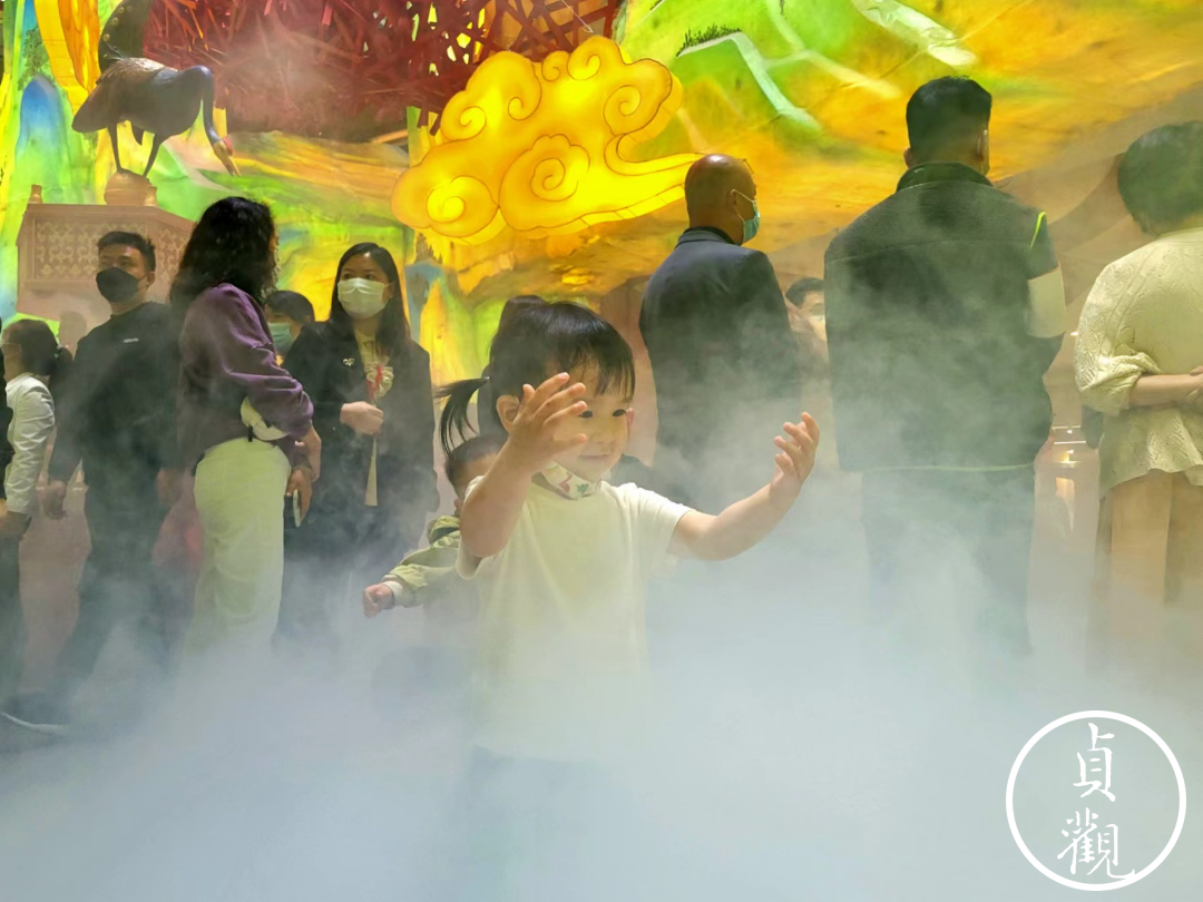 在长安十二时辰,到处都能感受到一种全方位被安排的刻意感。喷散的雾气上是激光投影的slogan,似乎就是让游客在进来第一眼就“哇”一下。