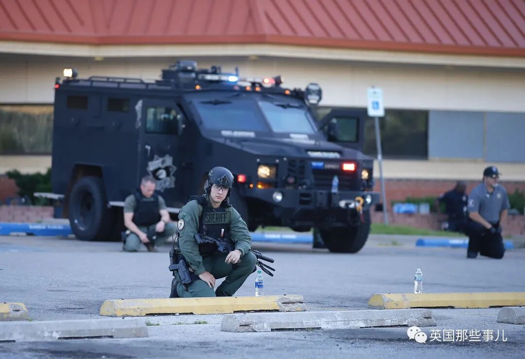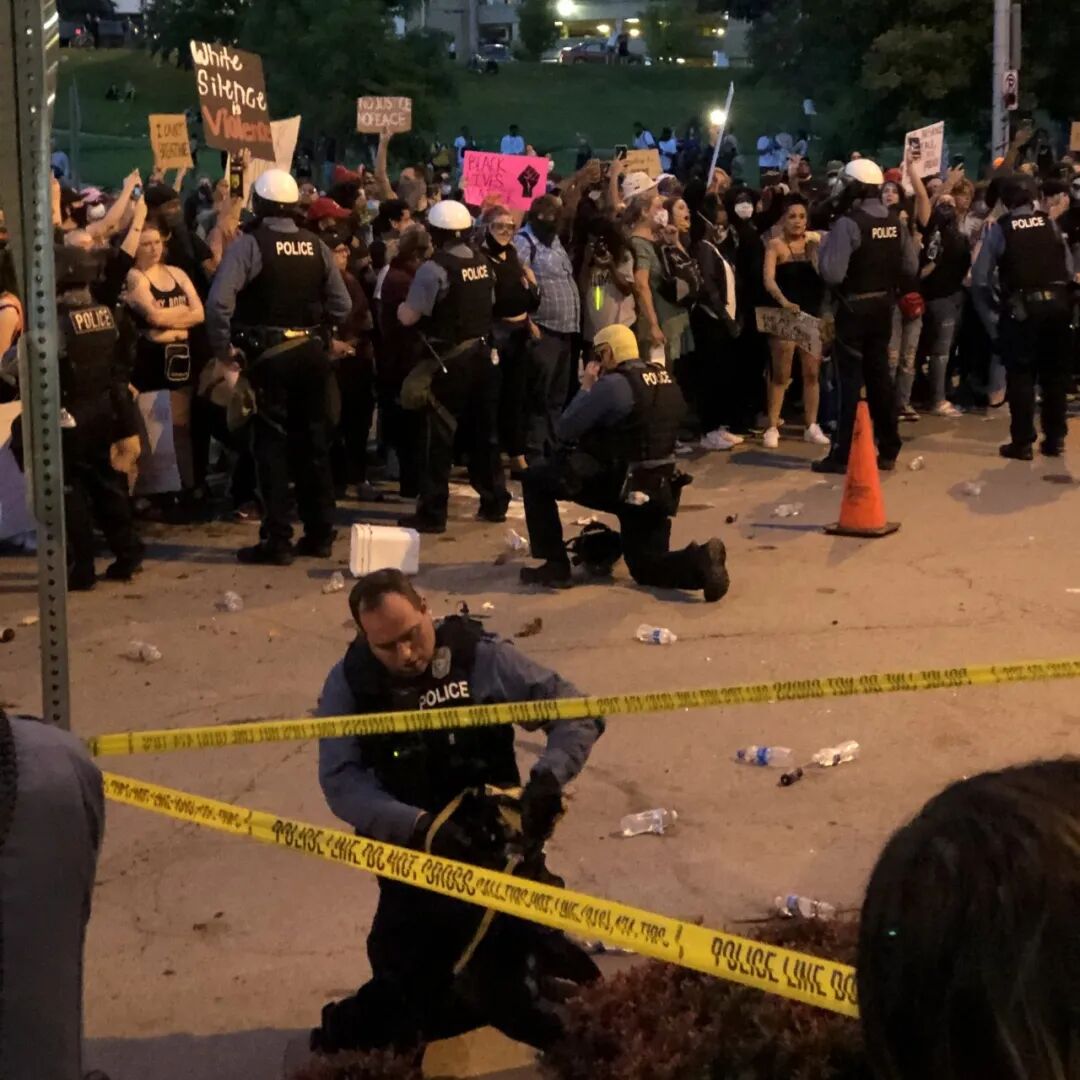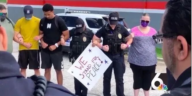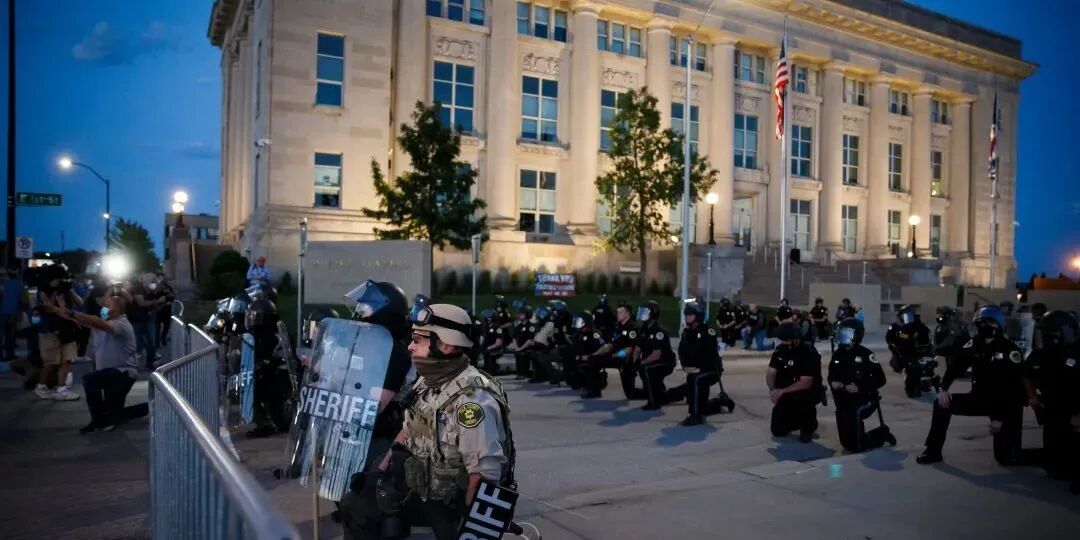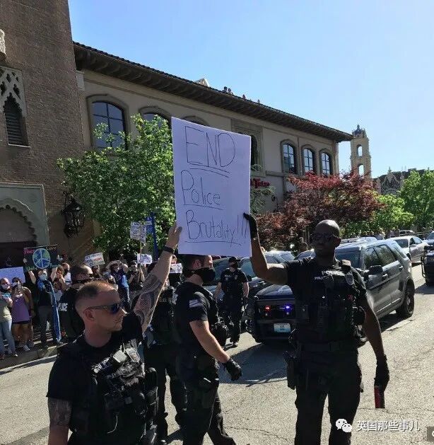 堪萨斯州的警察举着“结束警察暴行”的牌子...