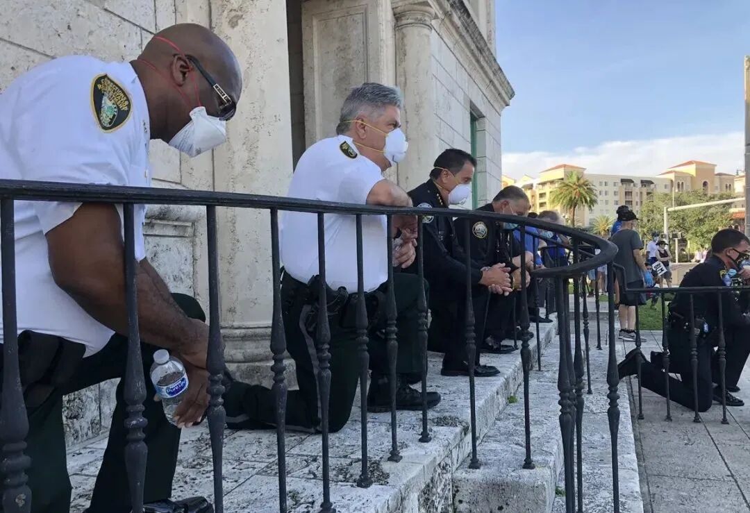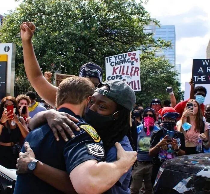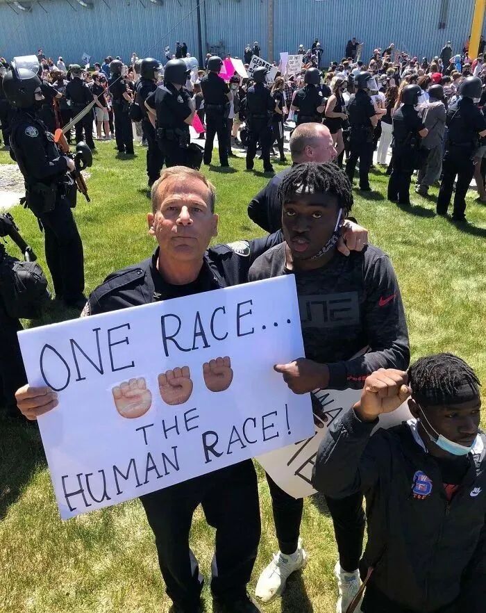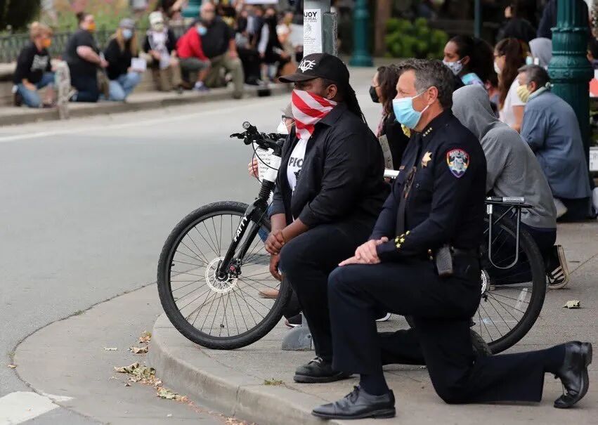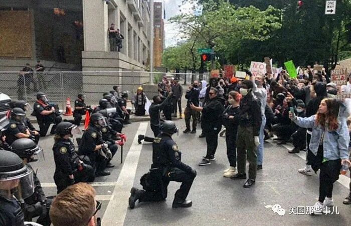 白人警察举着“为弗洛伊德争取正义”的牌子...