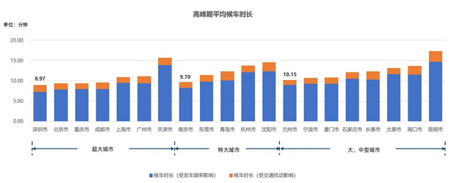 具体而言,深圳的高峰期地面公交平均候车时长最短,约为8.97分钟,其他超大、特大城市普遍都在10分钟左右。