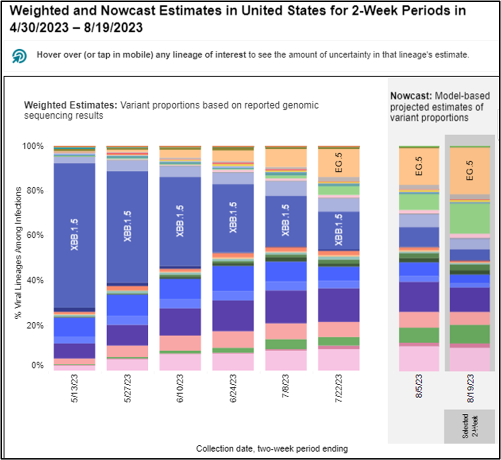 EG.5是因为它在取代XBB.1.5,有成为全球新主流病毒株的架势,进而吸引了大家的注意。比如看美国CDC最近的新冠病毒株监测: