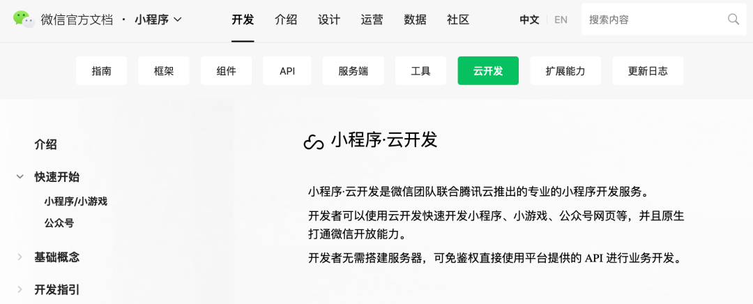 | 云函数 | 无需自建服务器 | 在云端运行的代码,微信私有协议天然鉴权,开发者只需编写自身业务逻辑代码 |