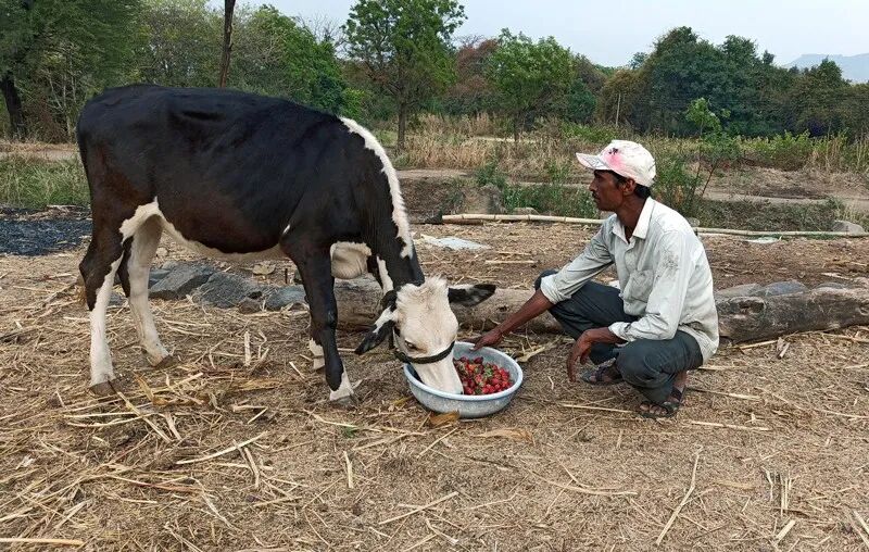 印度农民用草莓喂牛,疫情导致这些草莓无法运往城市销售。图片来源:Rajendra Jadhav/Reuters