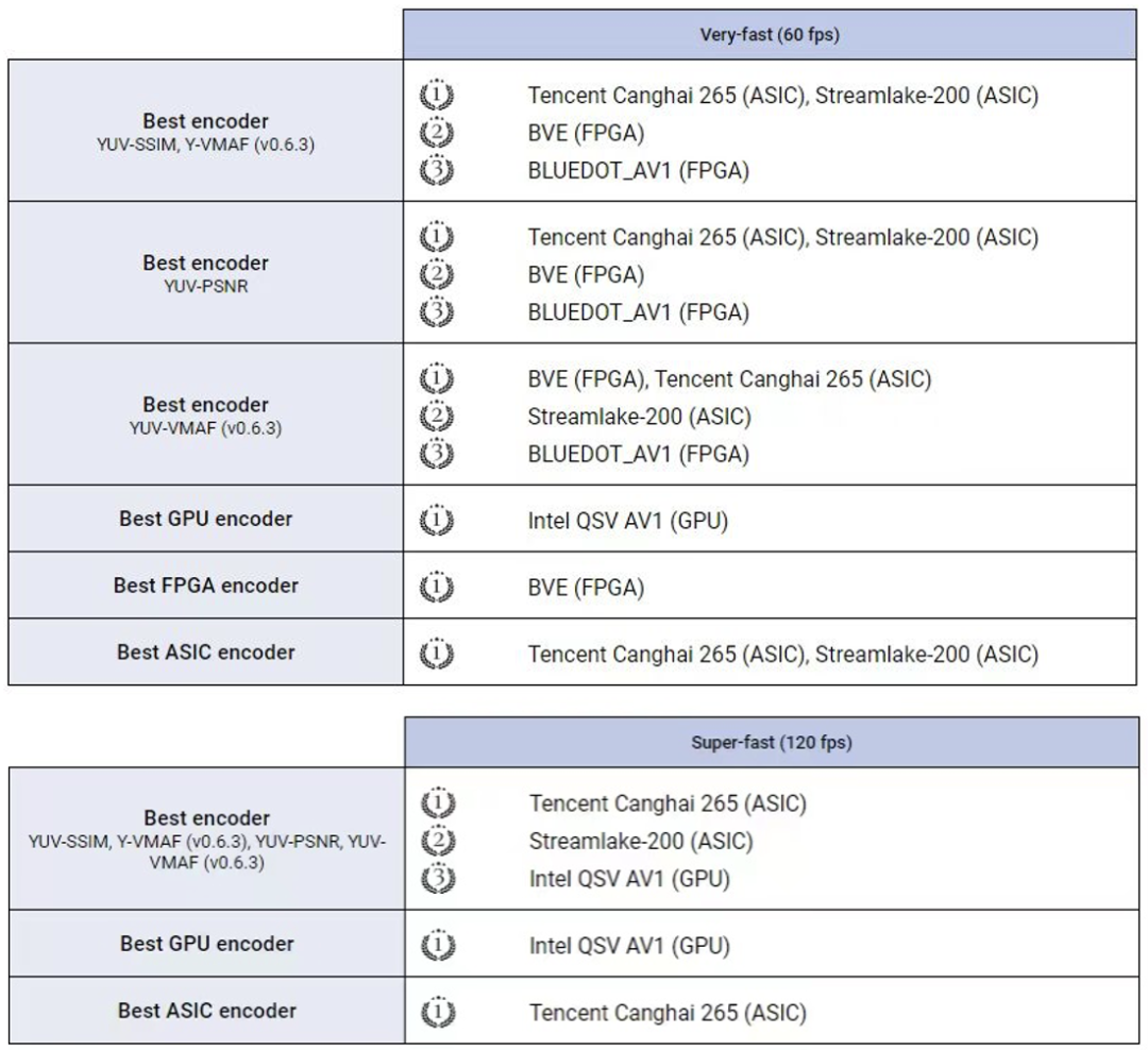 其中,TXAV1/V265编码器在所有分辨率测试中,包揽PSNR、SSIM和VMAF所有客观指标以及主观指标第一。同时,腾讯O264编码器也获得该赛道6项指标第一。