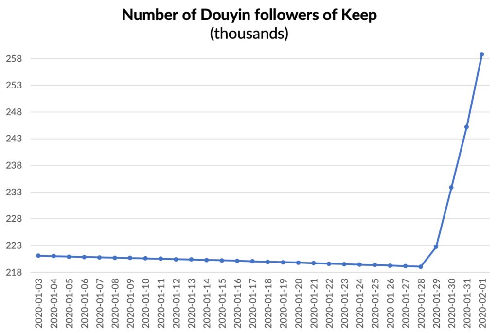 Keep hosts 3 live streaming classes per day, first announcing them via its hundreds of WeChat groups. Although the classes are free to watch, the Keep instructor asks the audience to follow the account, comment and like the live-stream. This engagement is picked up by Douyin's algorithm which exposes Keep to an even larger audience.