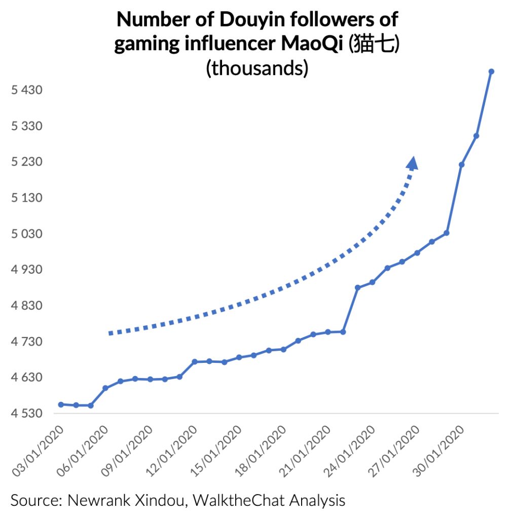 MaoQi (猫七), a leading gaming influencer, saw an increase of almost 1 million followers over the last month (a 20% growth month-over-month). The growth became exponential following the outbreak.