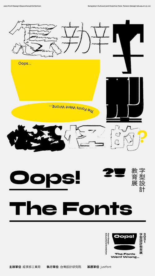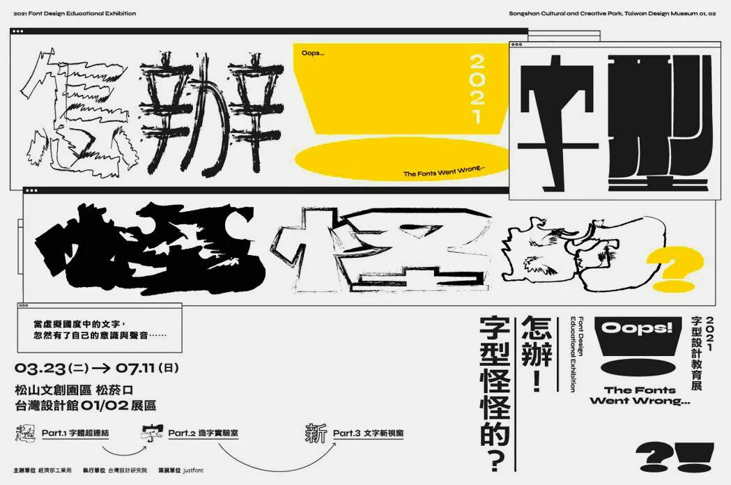 今年3月,字体设计团队justfont为台湾设计研究院策划了一场字体教育设计展「怎办!字型怪怪的?」。展览于台北松山文创园区开展,或许也是受到了全球疫情的启发,展览设置了一个有趣的故事设定:文字受到了各类病毒感染,所以“怪怪的”。展览包含三大展区,让观众进入“虚拟国度”,探讨字体缺席、变异、错置所造成的影响,感受因此而造成的各种不合时宜的情境,从而认识到使用合适字体的重要性。