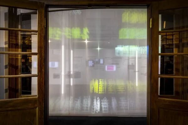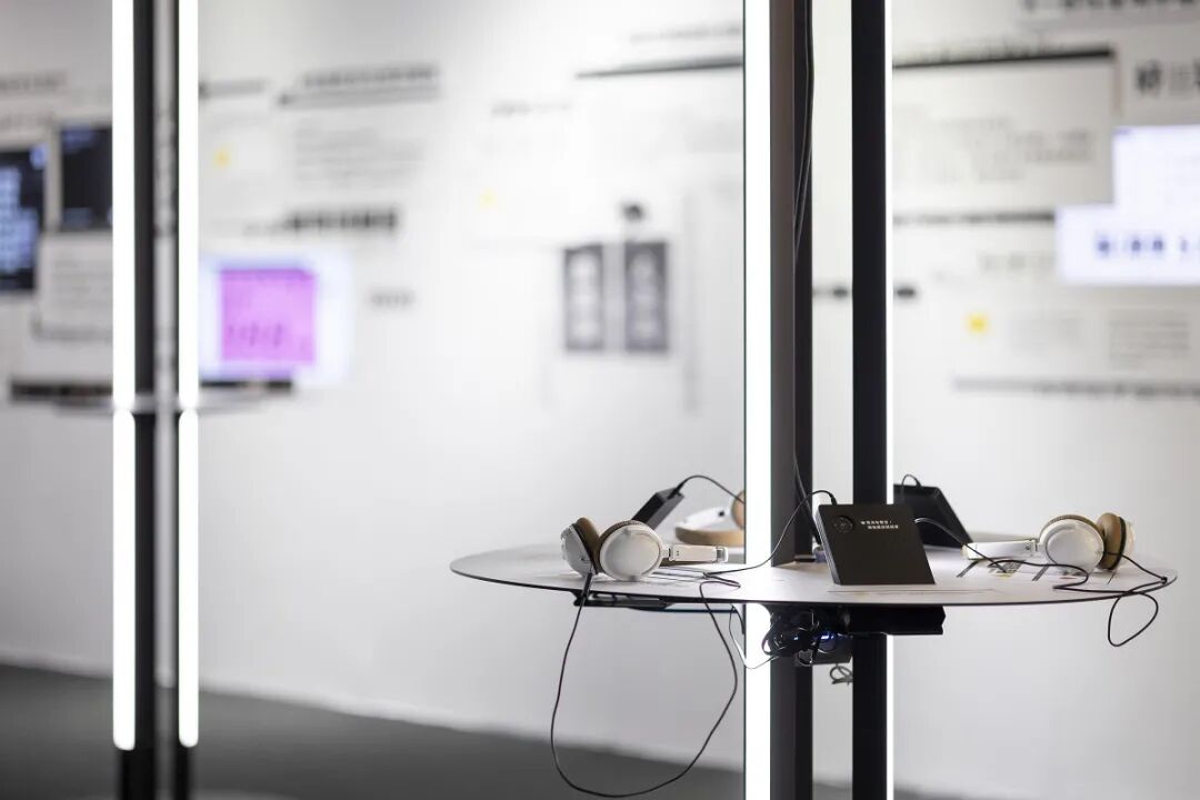 展览入口处设有纱材质半透明投影布幕,就像屏幕画面,观众可以通过手机扫码输入文字,文字就会转换成为“怪怪的字体”,立刻投影到薄膜上。这道“屏幕画面”的第二层次是展区中央像光柱的展桌,面对镜子会看到一道一道光柱形成的街廊,透过镜面连结虚实空间。