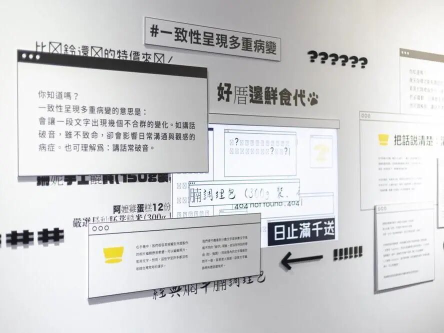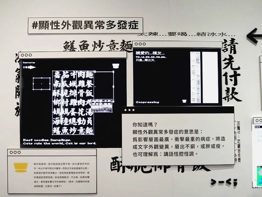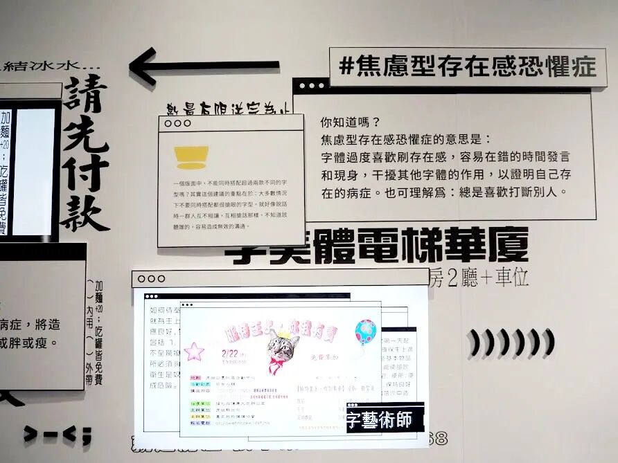再往后就是“字体变异标本墙”,呼应入口即时投影弹幕的薄纱,文字是横向的,营造处于一个大量讯息快速流动的空间感。标本墙展现了18组画面,具象化了“字体被病毒传染生病”的奇想,将字体的误用归纳为5种“病症”。如“后天指标功能失调症候群”(该显眼的字体看不清,多发于路标和告示)、“一致性呈现多重病变”(一段文字中出现个别不合群的字体)等等。当我们在一张广告传单上,看见两种以上字体互刷存在感,这就是字体得了“焦虑性存在感恐惧症”。
