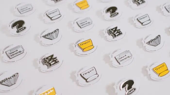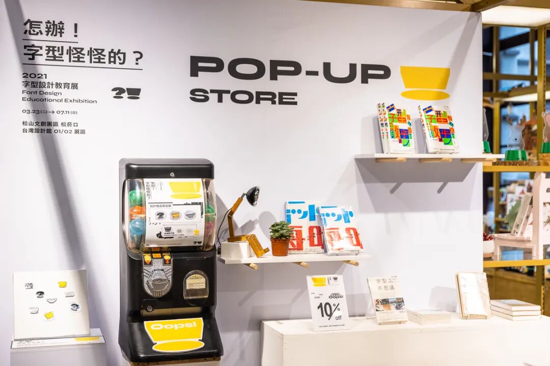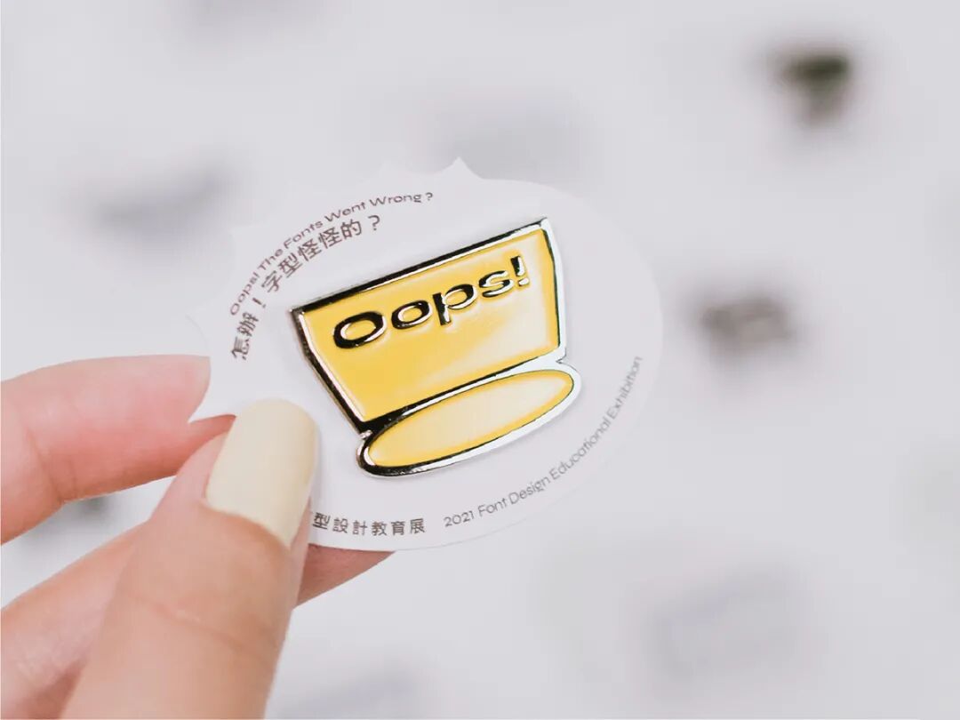 此次展览的衍生产品“Oops金属徽章”在展览的快闪店以扭蛋形式贩售,总共有6款,基于何庭安设计的主视觉形象制作而成。同时出售Mook《TYPOGRAPHY 字誌》和《字形散步 走在台湾:路上的文字观察》等书籍。