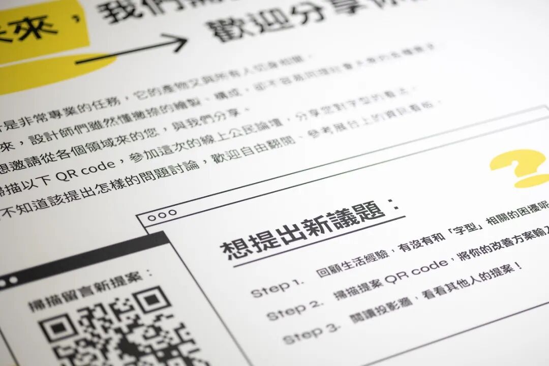 字体作为视觉文化的重要元素,应该也要配合时代脉动。展览的最后特别设置了“提案区”。在这里,由策展的justfont团队提出了6个希望台湾能够落实的关于字体的想法,也欢迎观众扫码留言、投票,表达自己对字体修正的看法。这些反馈回即时投影到展览的屏幕上,增强观众参与感。