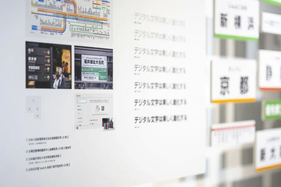 在第三展区,观众能够欣赏到各类字体的实际运用,包括路标、文本、立牌等生活常见的元素。justfont团队设计的“粉圆”体作为字体示例被展出。同时,展览也邀请了Morisawa(森泽)和Type Project两个日本字体设计团队一同参与展出。