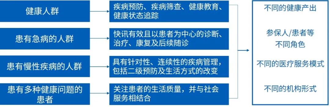 在医疗服务中,“以人为本”是以居民多元化健康需求为核心,针对不同人群提供不同医疗服务方案。如下图所示,对健康人群、急性病人群、慢性病人群及具有多种健康问题的人群进行健康需求分析,结合差异化的支付方式及健康目标,为各个人群提供针对性的医疗服务。此种模式能够改善不同人群的健康状况,改善医疗服务模式,有利于建立可持续发展的医疗保健体系。