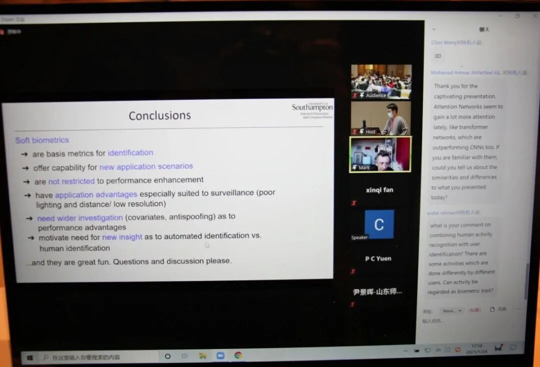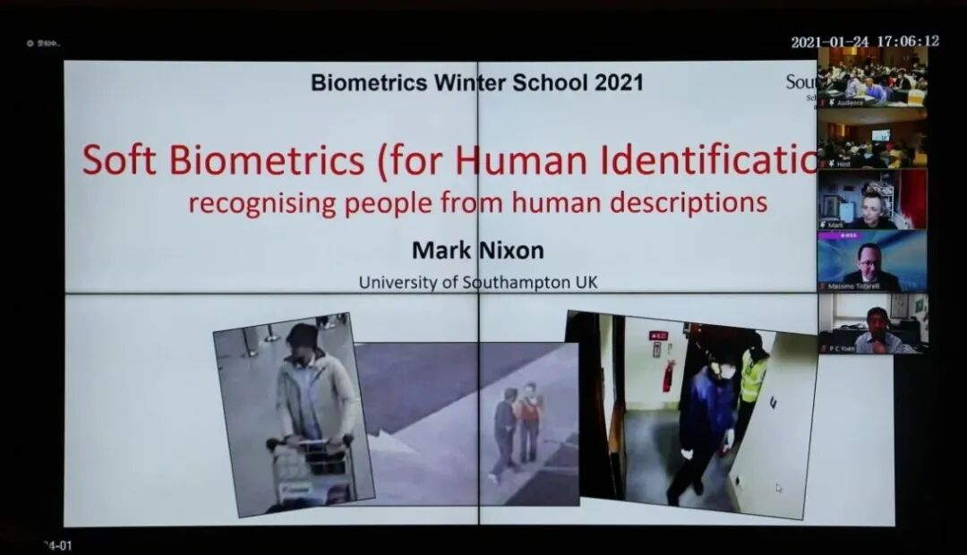 随后就是今天最后一场讲座,这场讲座由来自英国南安普顿大学的Mark Nixon教授线上主讲,他的讲座题目是“Soft Biometrics for Human Identification”。Mark Nixon教授首先讲述了传统生物识别系统的不足,比如对于一些图像分辨率低,无法获得面部和其他传统歧视性信息的犯罪不能进行很好的处理。因此,我们需要对年龄和性别的估算来扩充数据。在南安普顿,Mark Nixon教授一直致力于使用人类衍生标签的措施来进行识别,这是一个涵盖计算机科学和心理学的全新领域,弥合了计算机和人类视觉之间的语义鸿沟。对于身份识别的报告主题,参会人员积极地提出自己的见解,Nixon教授与各位参会者进行激烈的讨论。