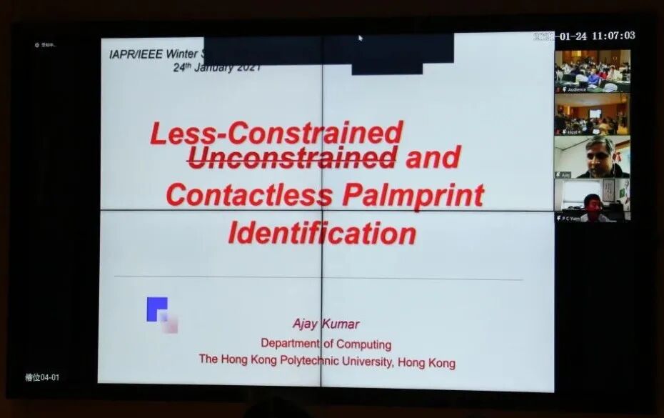 第二场邀请到了来自香港理工大学的Ajay Kumar教授,他为我们带来了题为“Less-Constrained and Completely Contactless Palmprint Identification”的线上讲座。首先,Ajay Kumar教授简单介绍了掌纹识别的由来和应用,并解释了掌纹识别技术中如何定位感兴趣区和掌纹识别早期工作中的一些局限性,例如无法在复杂的环境下进行手掌感兴趣区的提取和处理。随后,Ajay Kumar教授又给我们讲解了接触式和非接触式掌纹识别的差异,以及非接触式掌纹识别的优势。最后Ajay Kumar教授介绍了自己组是如何在复杂背景下是如何完成掌纹检测的,并比较了在两组数据集下,掌纹采集系统的不同表现,同时还比较了在统一数据集但不同传感器下的跨传感器匹配情况和结合了手掌血管图像的跨谱的匹配情况。