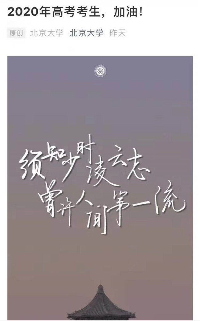 先是北大的官方公众号引用了两句诗——“须知少时凌云志,曾许人间第一流”,为参加高考的学子们加油鼓气。然后有人依据百度百科,说该诗的下半句是“哪晓岁月蹉跎过,依旧名利两无收”,嘲笑北大赠给高考学子的诗句,底色实是垂头丧气。