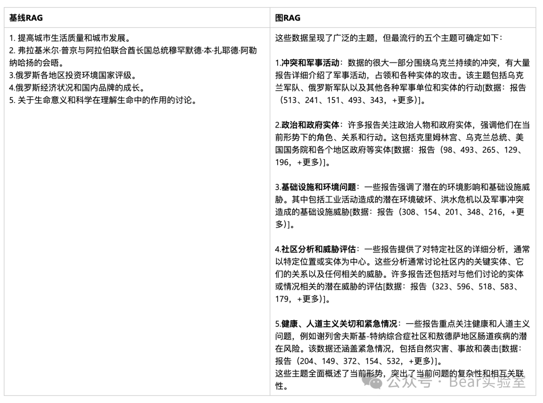从基线 RAG 的结果来看,我们发现列出的主题都与两国之间的战争没有太大关系。正如预期的那样,向量搜索检索到了不相关的文本,并将其插入到LLM的上下文窗口中。包含的结果很可能以“主题”一词为关键,导致对数据集中发生的情况的评估不太有用。