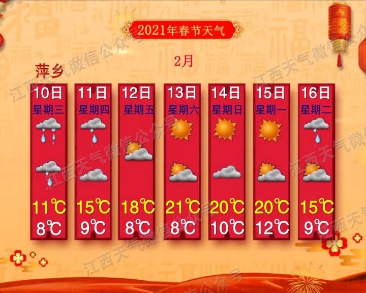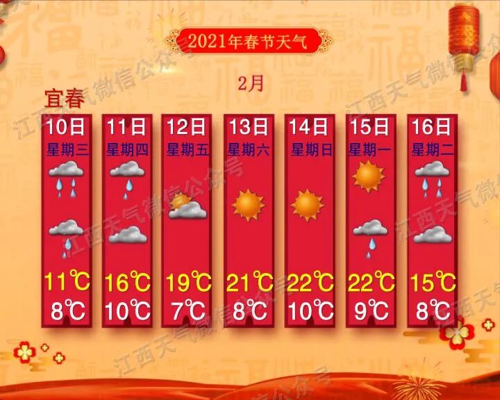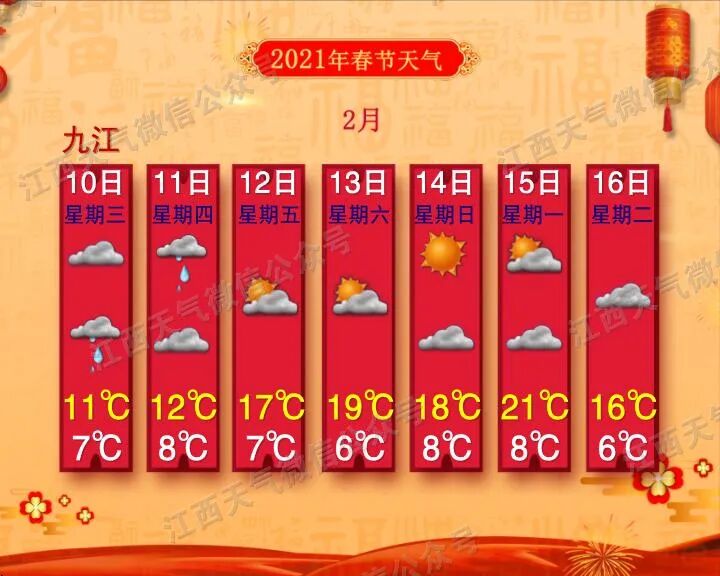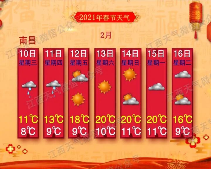 除夕(11日):全省小雨转阴。最低气温全省8~11℃;最高气温赣北赣中12~14℃,赣南14~16℃。