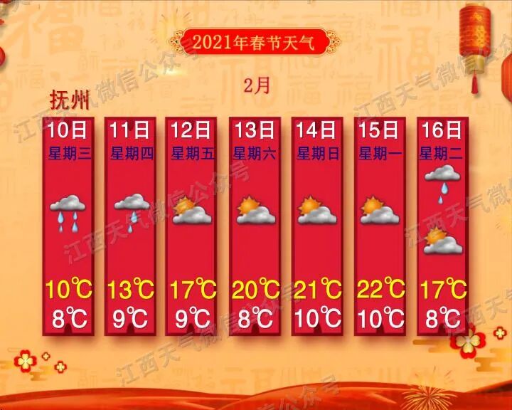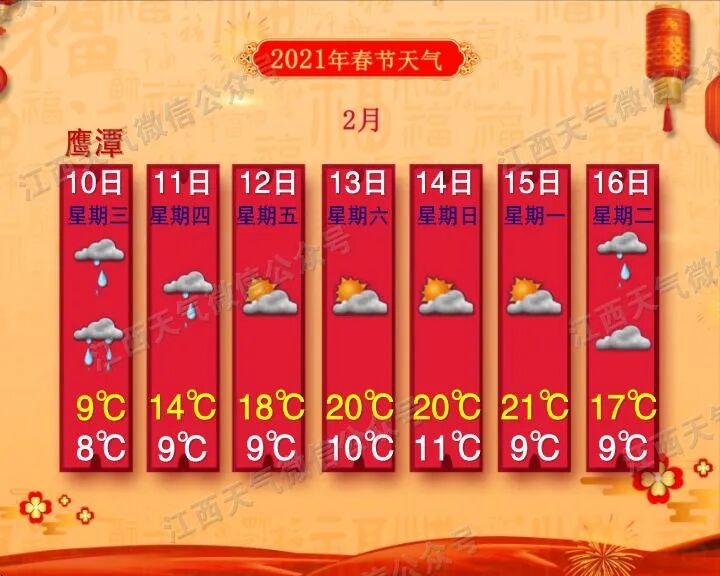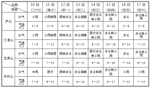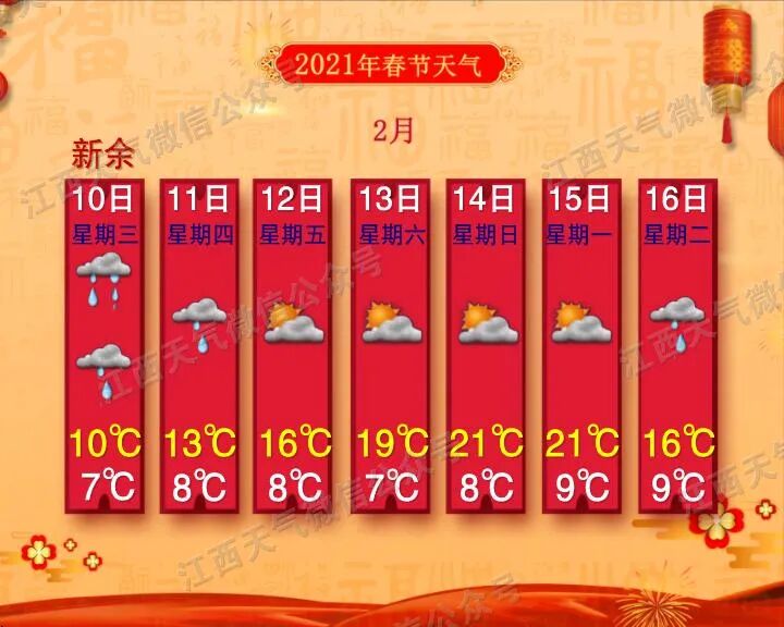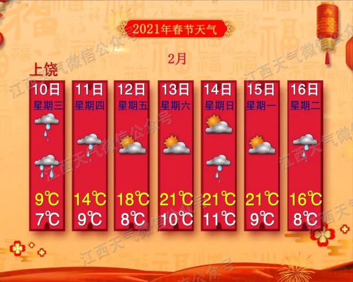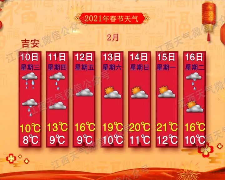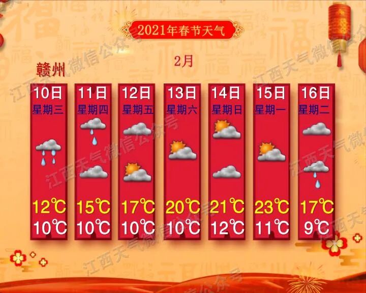 初五至初六(16-17日):赣中赣南阴天有小雨,局部中雨;赣北以阴天多云天气为主,局部地区有小雨。16日最低气温全省8~10℃;最高气温全省14~17℃。