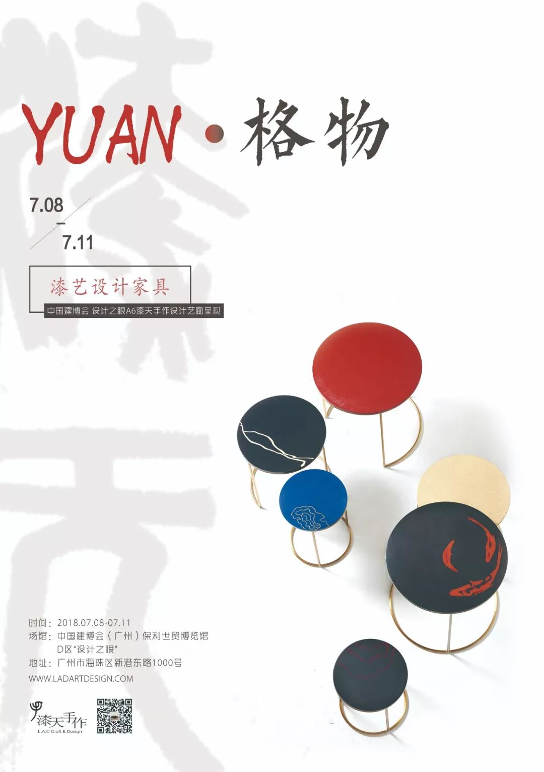 2018年7月8日-11日,漆天手作将在2018中国建博会(广州)设计节暨中国国际家居设计节博览会上,呈现“YUAN 格物”原创漆艺设计家具的展览,“YUAN”漆艺边桌将在期间首次亮相。“YUAN”系列漆艺边桌将东方漆艺术融合到西方设计语汇中,让一件家具多用途且好玩。漆天手作设计艺廊是唯一获邀参与此次设计节的漆艺设计艺廊,并将参与到“TOP设计大师论坛”,与来自国内外的知名设计师现场一同分享漆艺与设计思想的碰撞。