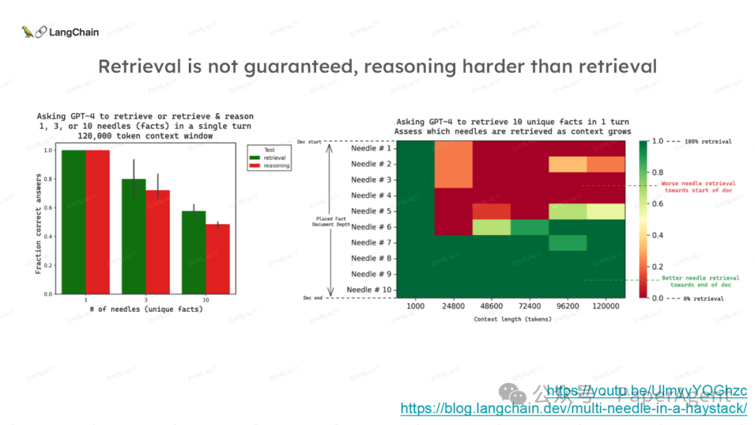 LangChain团队(Lance Martin 软件工程师)结合几个最新研究项目成果来探讨、分析这个问题。通过多针“大海捞针”方法,深入分析了长上下文大模型在事实推理和检索(reasoning & retrieval in long context LLMs)方面的局限性,接着分析了长上下文给RAG带来的新变化,如以文档为中心的索引技术(RAPTOR+Long embeddings)和RAG的流程变化(Self-RAG、CRAG)。