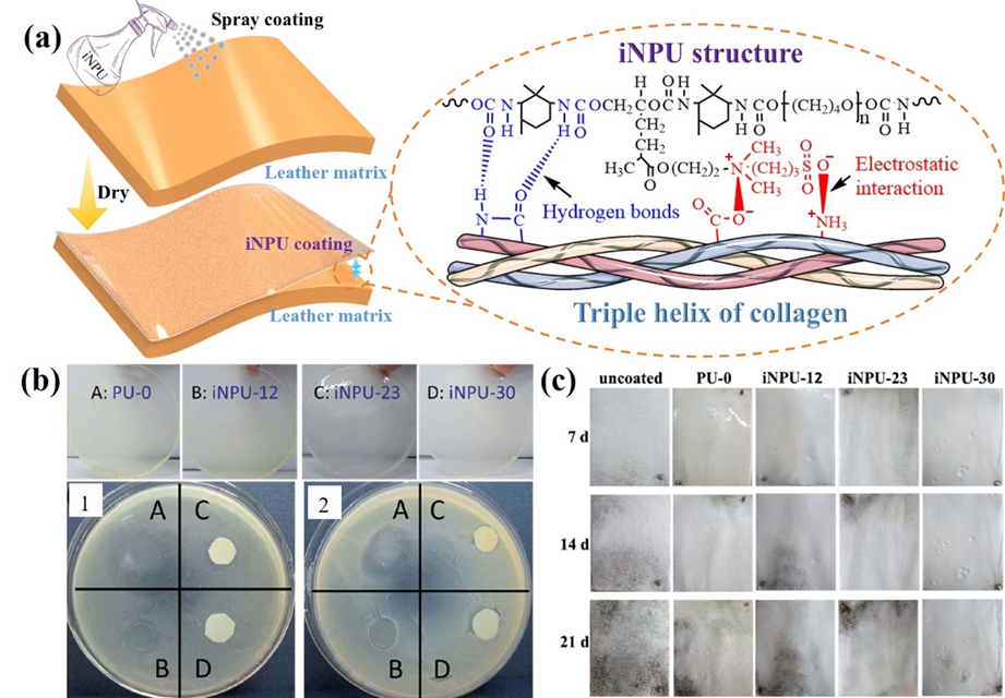 图3. 两性离子改性聚氨酯皮革涂层:(a)喷涂示意图;(b) 对大肠杆菌和金黄色葡萄球菌的抗菌能力;(c) 抗霉菌粘附能力。