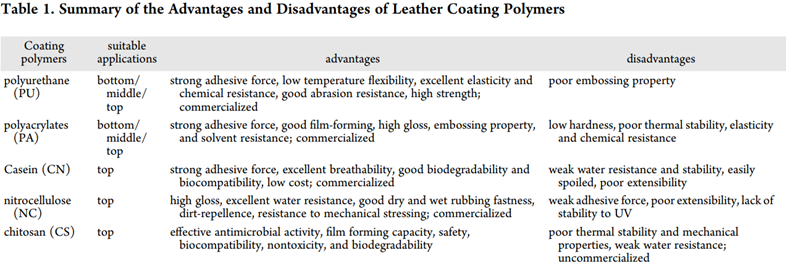 表1. 皮革涂饰用的聚合物涂层的优缺点总结。