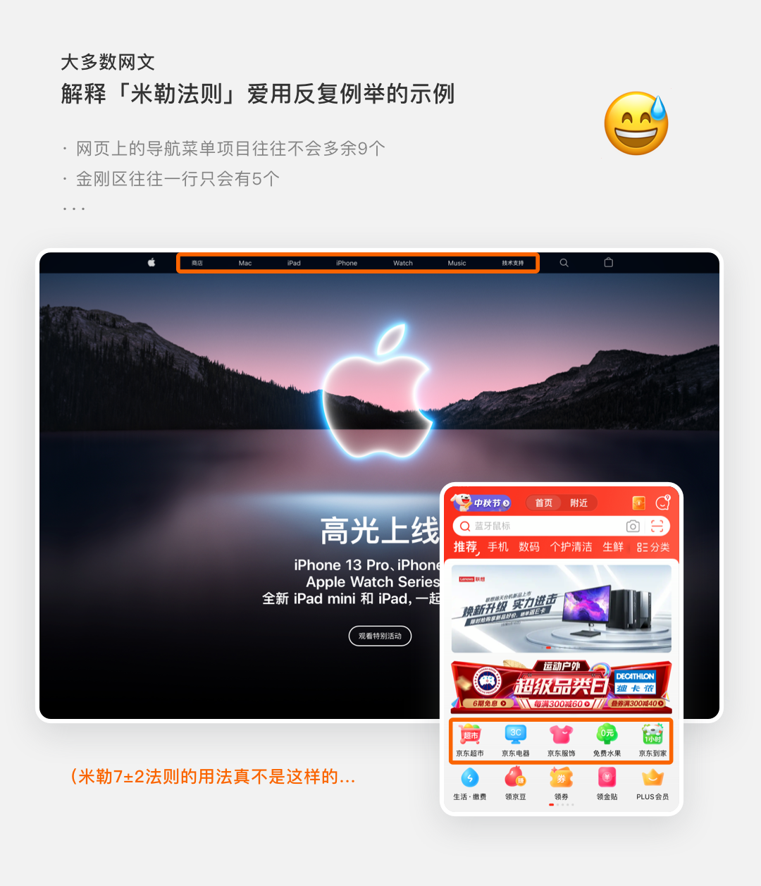 如果文章开头导航菜单、金刚区的例子,你硬要说是参考了神奇数字7±2,我认为勉强也算行吧(嗯...勉强算)。