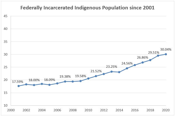 该图显示了自 2001 年以来每年被联邦监禁的人口中原住民的百分比。被监禁的原住民人口的比例从 2001 年的 17.6% 稳步上升到 2020 年的 30.4% | 资料来源:惩教调查办公室加拿大