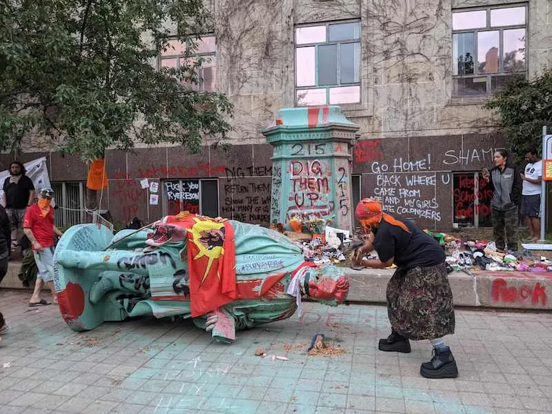 2021年6月6日,加拿大多伦多,超千人参与抗议加拿大种族灭绝黑暗史的示威游行活动,挖出215具儿童遗骸的原住民寄宿学校创建者埃格顿·瑞尔森的雕像被抗议者推倒。